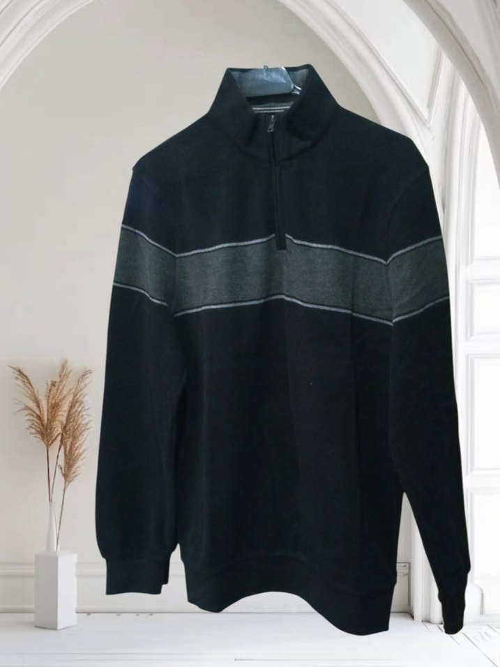 Erkekler için siyah fermuarlı yarım balıkçı yaka sweatshirt, uzun kollu ve normal kesimdir. Göğüs kısmında koyu renk yatay şerit bulunur, yumuşak ve sıcak kumaştandır. BEDENLERİMİZ S.M.L