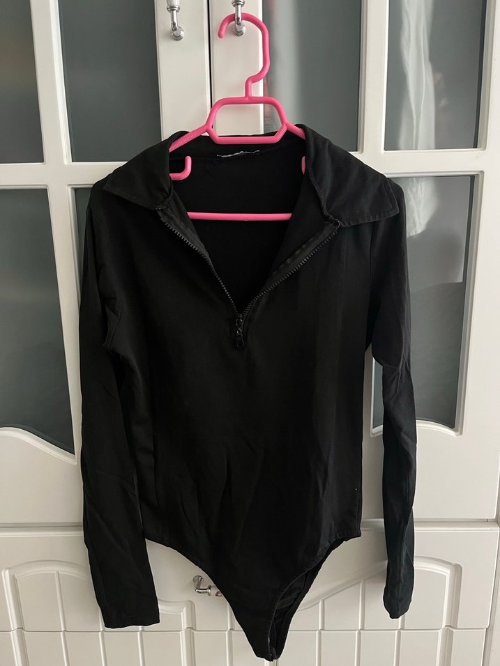 Fermuarlı, yüksek yakalı ve uzun kollu siyah kadın bluz. Sentetik kumaştan üretilmiş, midi boyda ve dar kesim. Sokak ve athleisure tarzına uygun.