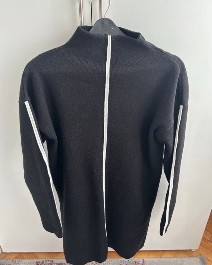 Siyah, fermuarlı detaylı, yüksek yakalı ve uzun kollu kadın elbise. Gri şeritlerle sokak ve spor tarzına uygun.