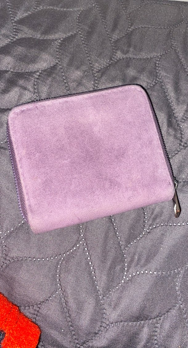 Mor renkli kadın cüzdanı, yumuşak süet malzeme ve fermuarlı kapanışa sahiptir. Nakışlı deseni ve rahat, karşı kültür tarzıyla günlük kullanıma uygundur.