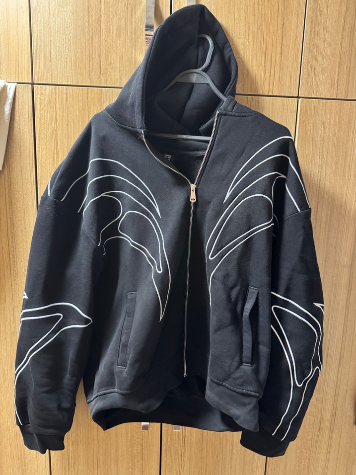 Erkekler için siyah, uzun kollu, yüksek yakalı ve baskılı desenli bol kesim sweatshirt. Fermuar ve ceplidir, yumuşak ve sıcak kumaştan üretilmiştir. Günlük kullanım için uygundur.