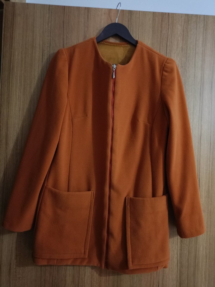 turuncu parlak yüzeyli midi uzunlukta kadın kaban, fermuarlı ve normal kesime sahiptir. Uzun kollu, rahat ve normcore tarzda, ofis için uygundur.