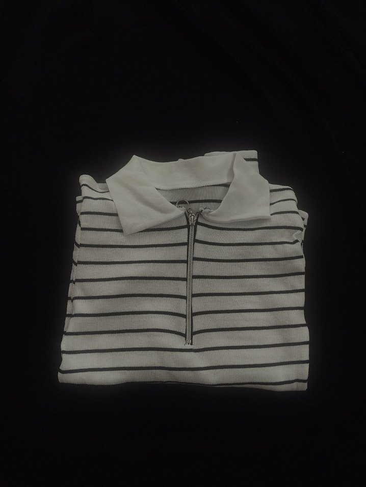 fermuarlı yakalı ve uzun kollu polo tişört. Normal boyda ve çizgili desende. Hiç kullanılmamıştır ikili fiyatıdır.