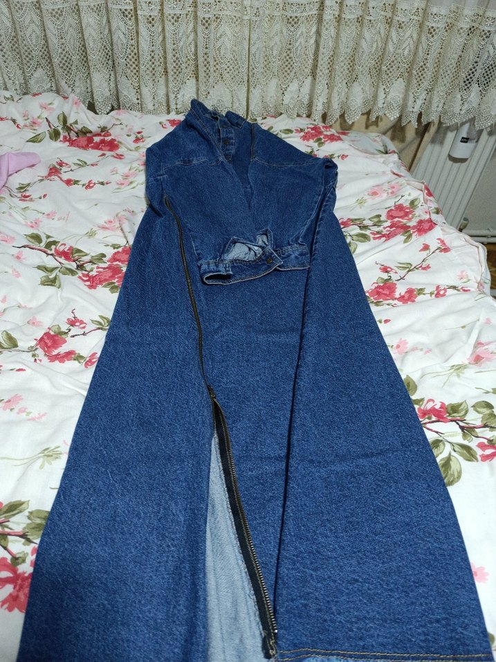 Fermuarlı detaylı, uzun ve bol kesim kadın kot elbise. Mavi klasik denimden yapılmıştır, günlük kullanım için uygundur.