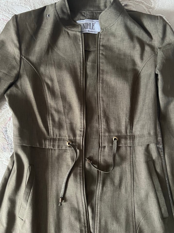 Fermuarlı ön ve kesimli yakaya sahip yeşil sadece fermuarı bozuk ve şapkası yok aldığımda da yoktu öyle almıştım