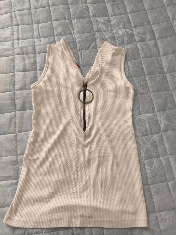 Fermuarlı ön kısmı halka detaylı V yaka, beyaz, sıfır kollu, vücuda oturan midi uzunluğunda kadın atlet.