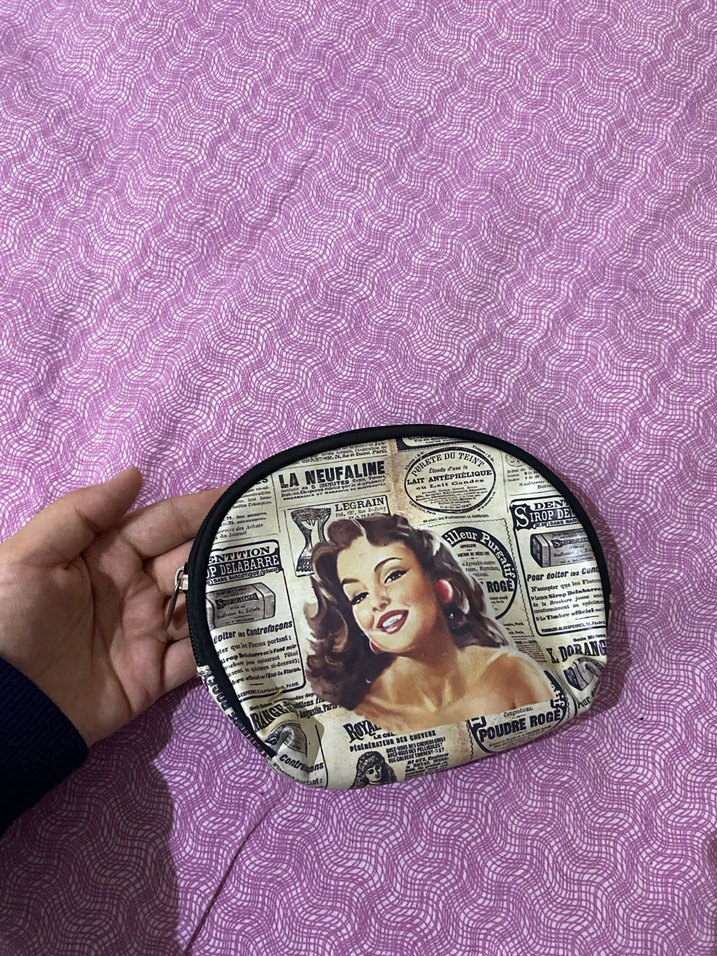 Sentetik kumaştan yapılmış, fermuarlı, pastel kahverengi vintage kadın makyaj çantası, baskılı retro reklam desenli. Üzerinde 'LAMEUFALIN' yazısı bulunur.