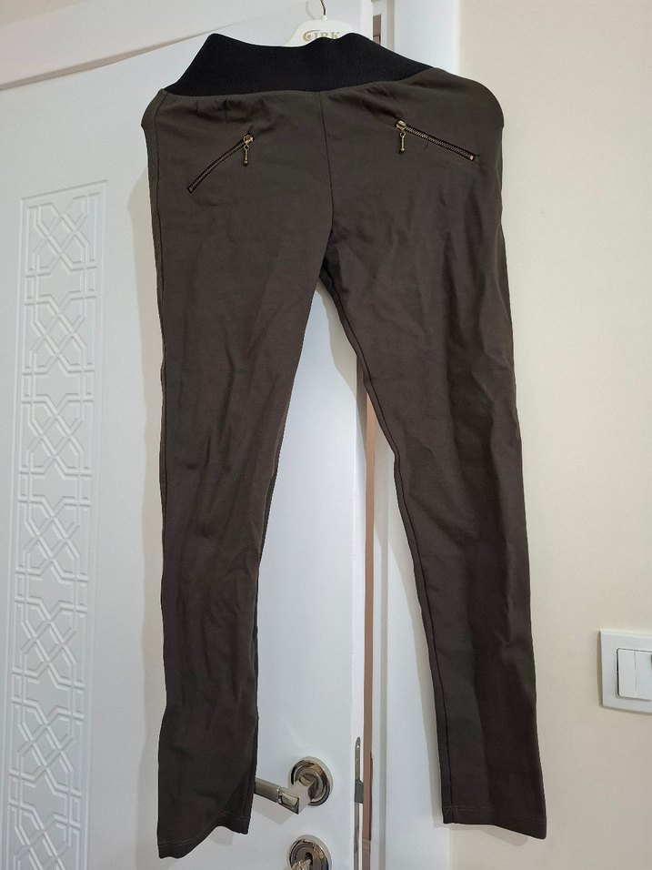 Fermuarlı arka cepleri olan, vücuda oturan kahverengi kadın kumaş pantolon. Normal midi boyda, sokak stili ve günlük kullanıma uygun.
