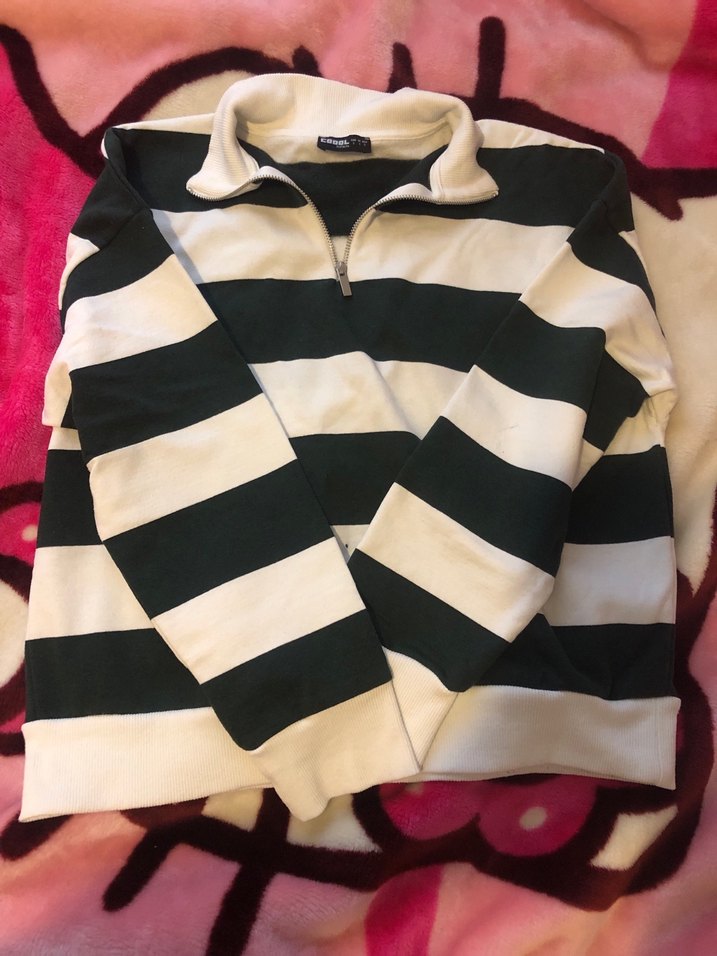 Fermuarlı yakası ve uzun kolları olan, siyah beyaz çizgili, yumuşak kumaştan yapılmış kadın sweatshirt. Günlük rahat stil için uygundur. Sorunsuzdur. Önden fermuar detayı vardır.