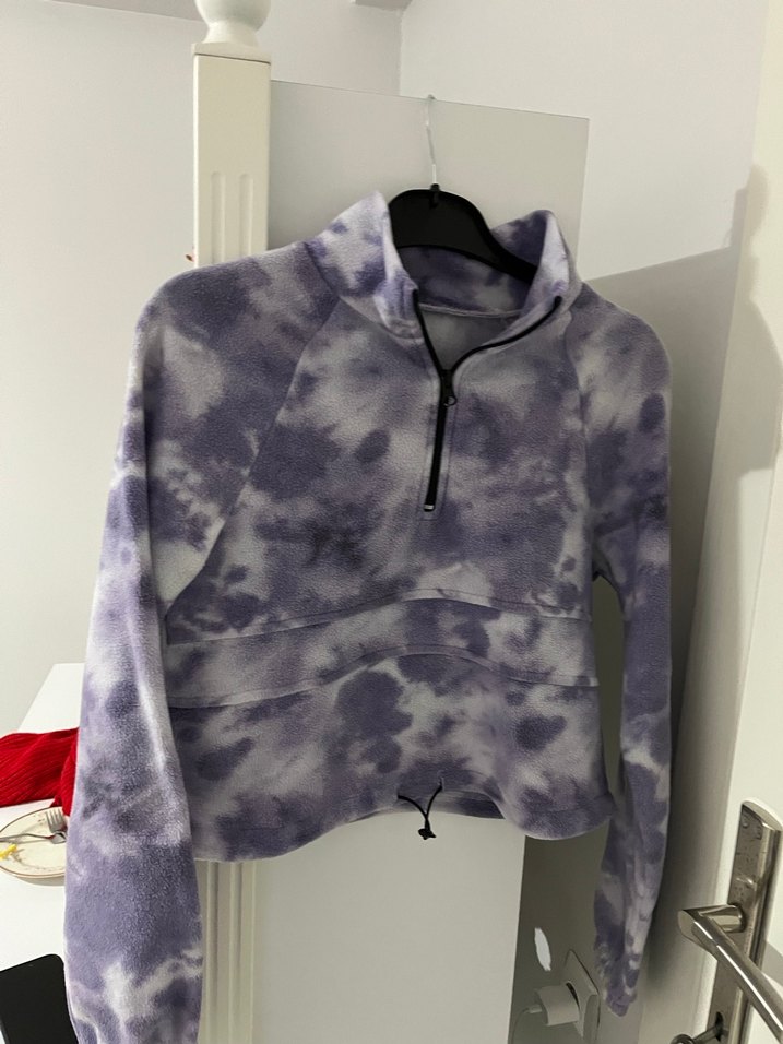 Fermuarlı ön kısmı ve uzun kollu, yüksek yakalı, mor-gri batik desenli, yumuşak ve sıcak kumaştan yapılmış dar kesim kadın sweatshirtü.