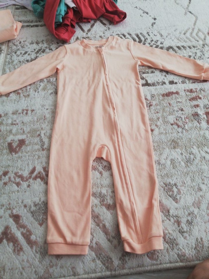Pastel pembe renkte, ön fermuarlı, yumuşak kumaştan yapılmış uzun kollu bebek kız tulumu. 2 ve 3 yaş için uygundır