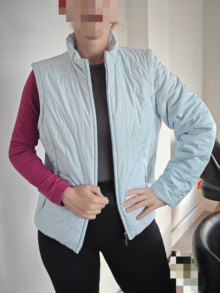 hem yelek hem mont olarak kullanılabilecek. kolları fermuar ile çıkan ve arka kısımda gizli kapüşonu olan bulut mavisi mont #yelek #mont