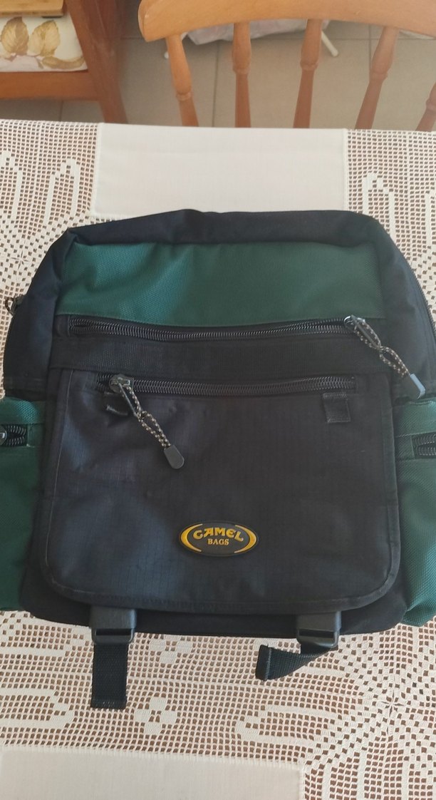 Erkekler için fermuarlı, koyu yeşil ve siyah renklerde biker tarzı sırt çantası. Çoklu cepleri ve baskılı deseni bulunur. ️