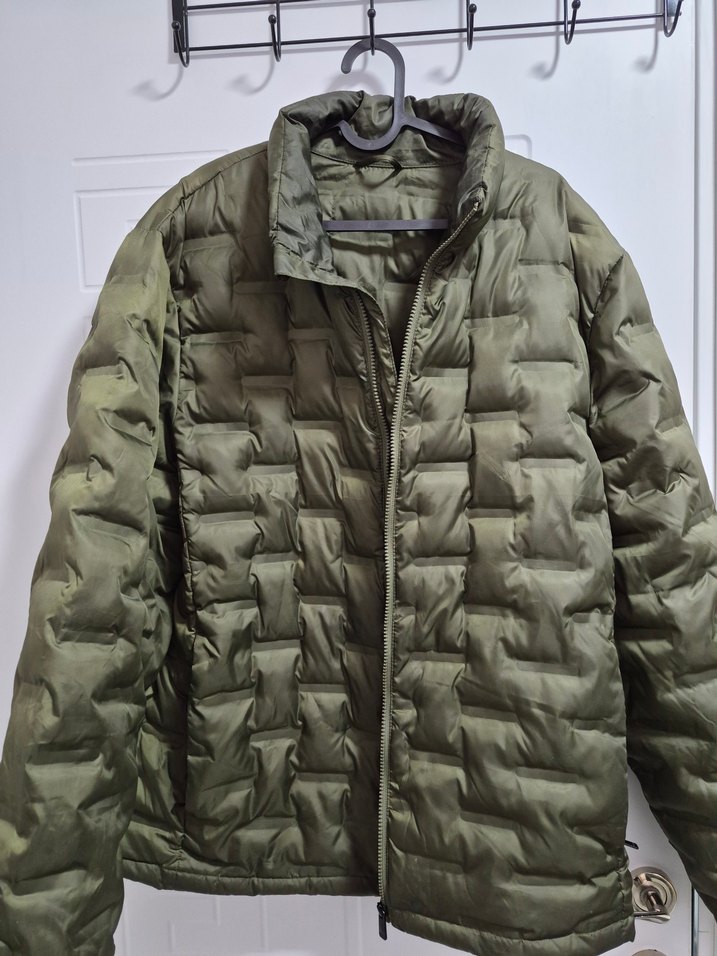 Fermuarlı önü, uzun kollu, yeşil erkek mont. Yumuşak sentetik kumaştan, midi boy ve dar kesim, günlük sokak stili için uygundur. L beden bol kesim