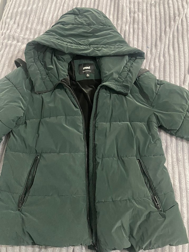 Yeşil renkli, fermuarlı, kapüşonlu kadın kışlık mont. Uzun kollu ve fit kesim, yumuşak ve sıcak kumaştan üretilmiştir.