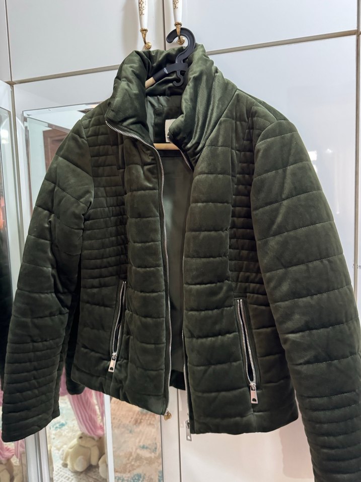 Fermuarlı, boğazlı yaka ve yeşil renkli, yumuşak ve sıcak kumaştan yapılmış, normal boy ve askılı kollu fitted mont. Günlük sokak stili için uygun.