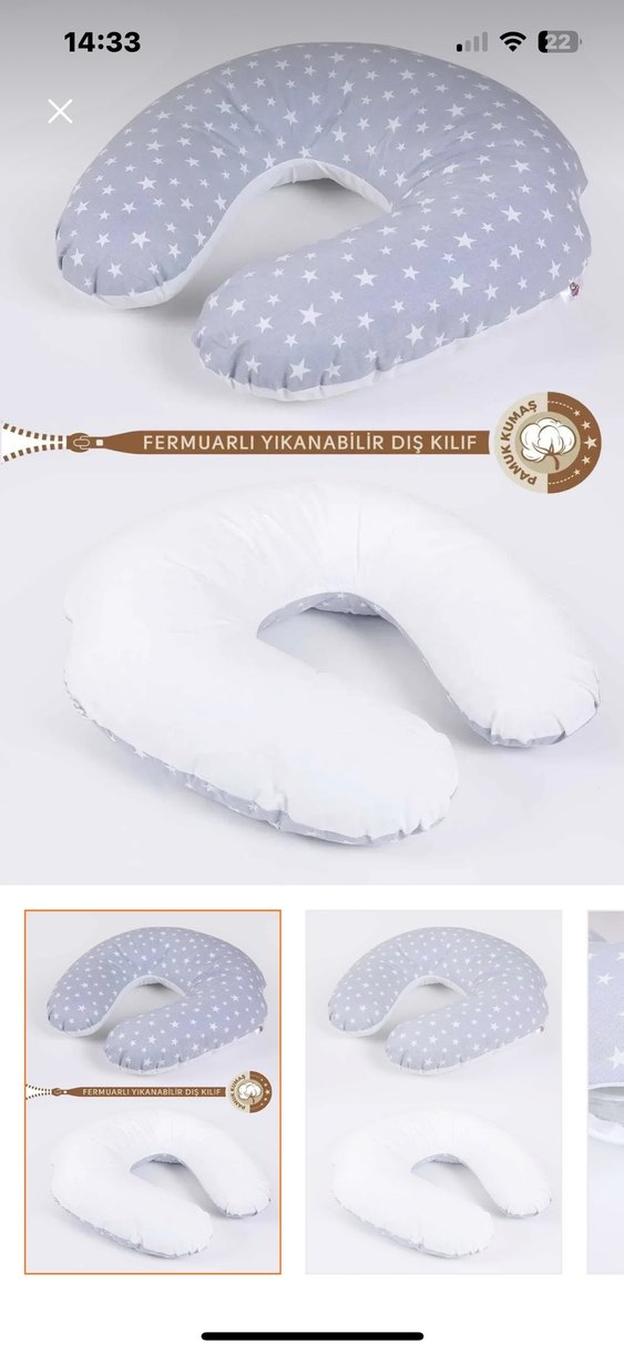 Gri ve beyaz yıldız desenli, fermuarlı yıkanabilir dış kılıfa sahip emzirme ve hamile yastığı. Rahat destek sağlar. Biz aşırı rahat ettik çok memnun kaldım severek kullandım bir sorunu yok