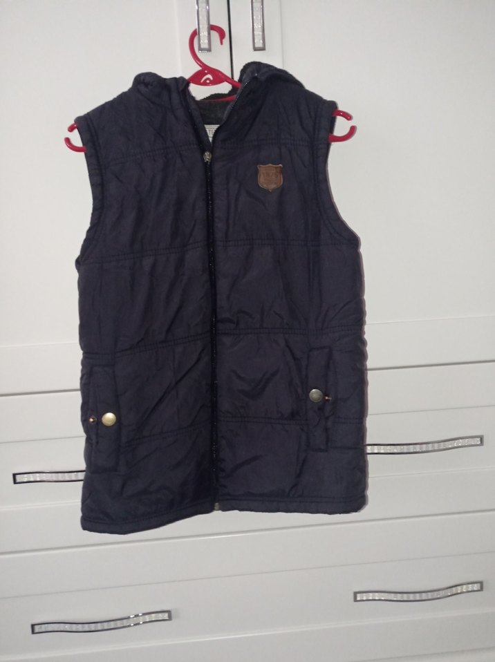 lacivert renkte, yüksek yakalı ve fermuarlı çocuk kolsuz yelek. Yumuşak ve sıcak kumaştan, iki düğmeli cep içerir. Günlük ve sokak stiline uygun.