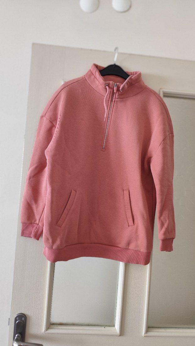 Fermuarlı yüksek yakalı, uzun kollu, bol kesim pembe sweatshirt. Yumuşak ve sıcak kumaştan, normal midi boyda, ön cepli, günlük kullanıma uygun.