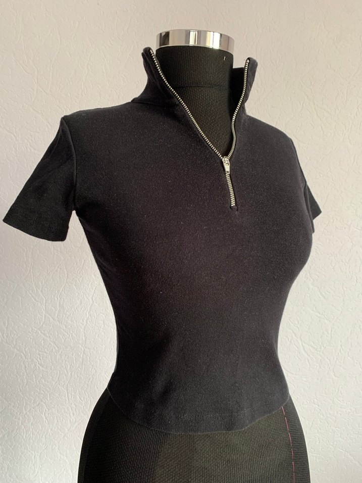 Brandy Melville marka. Fermuarlı yüksek yakalı, bel hizasında, S beden çok şık bir tişört. Sayılı kullanıldı.