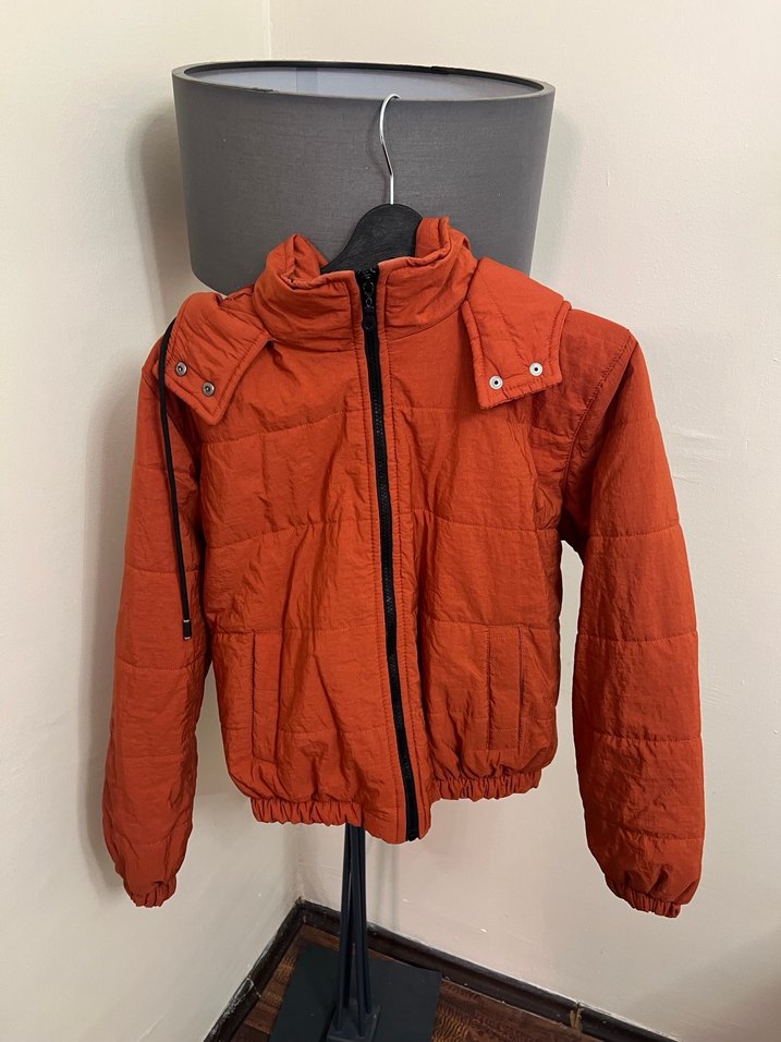 Fermuarlı, yüksek yakalı ve uzun kollu, rahat ve sıcak dokulu kiremit kadın mont. Dış mekan kullanımı için uygun, rahat kesim.