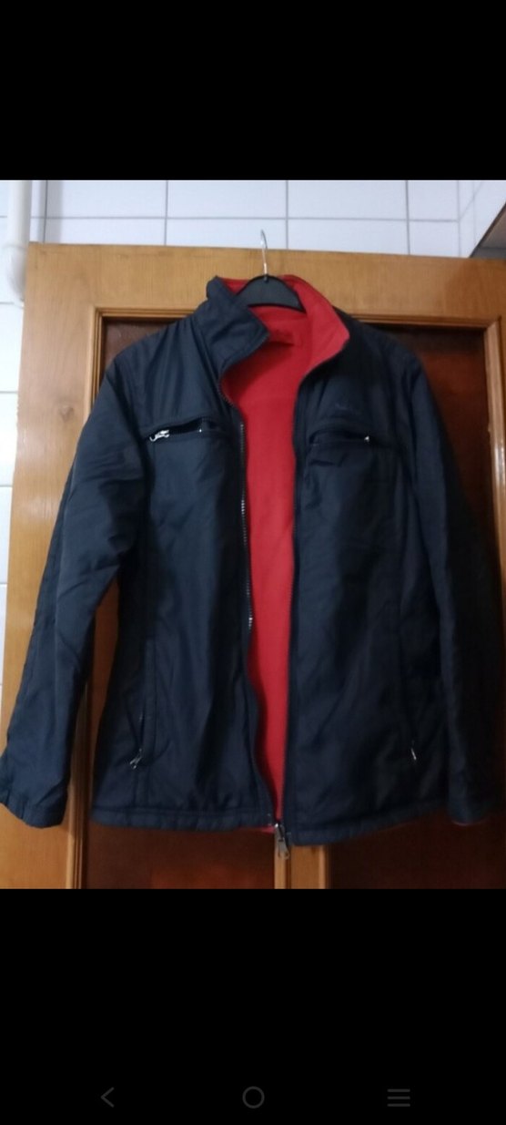 Fermuarlı, yüksek yakalı ve uzun kollu, kırmızı iç astarlı siyah erkek çocuk mont. Yumuşak ve sıcak kumaştan, günlük rahat stil için uygun.