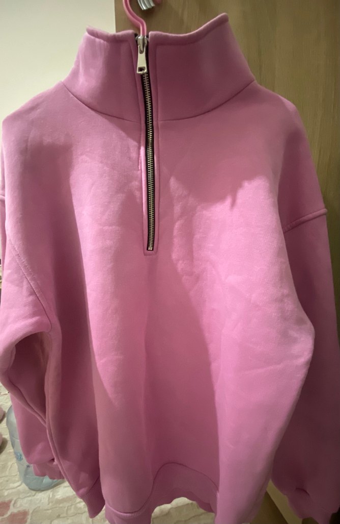 Pastel pembe renkte, fermuarlı yüksek yakalı, uzun kollu ve bol kesim rahat sweatshirt. Normal midi boyu ve yumuşak kumaşıyla günlük sokak stiline uygun.
