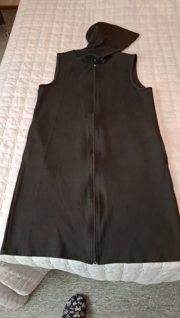 Düz siyah, fermuarlı ve yüksek yakalı kadın yelek, vücuda oturan kesimi ve midi boyuyla minimalist gotik tarz sunar. Kolsuz ve sentetik kumaştan üretilmiştir.Boy:80 cm Bel:44 cm iade yoktur