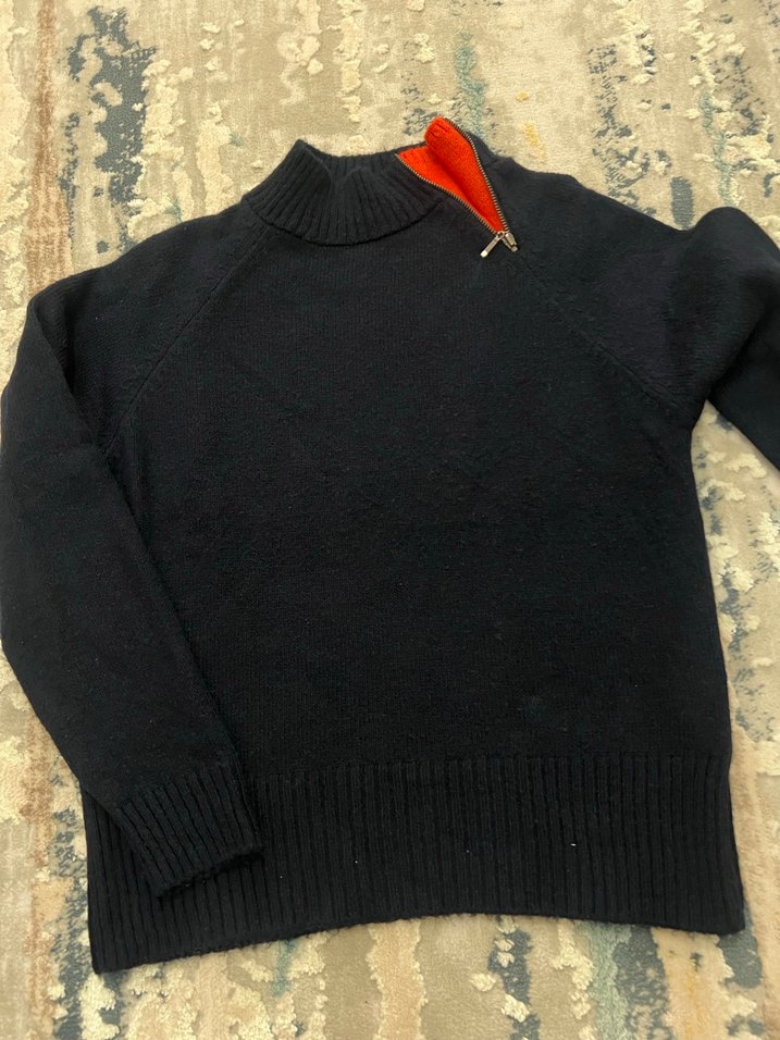 Fermuarlı yüksek yakalı, uzun kollu, bol kesim lacivert yün kadın kazak, rahat ve trend sokak stili sunar.