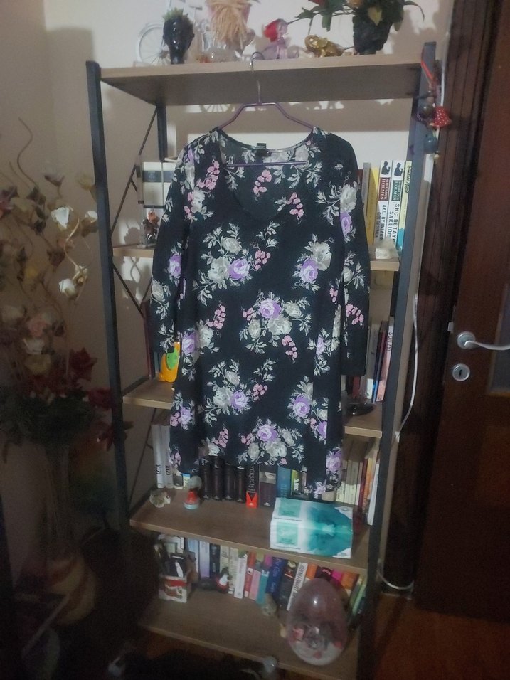 Mor çiçek desenli, V yaka ve dantel detaylı, uzun kollu bol kesim Midi boy ve yumuşak sentetik kumaştan.alindi giyilmedi