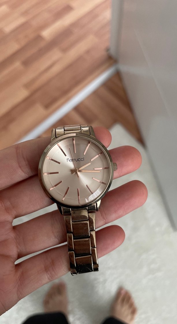 Ferrucci markalı, parlak altın renkte, minimal tasarımlı kadran ve tokalı metal kayışa sahip kadın kol saati. ⌚