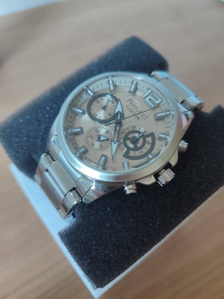 Ferrucci markalı beyaz karton kutu ve gri detaylı kağıt torbada kol saati . Paraya ihtiyacım olduğu için satıyorum 2 yıl garantili