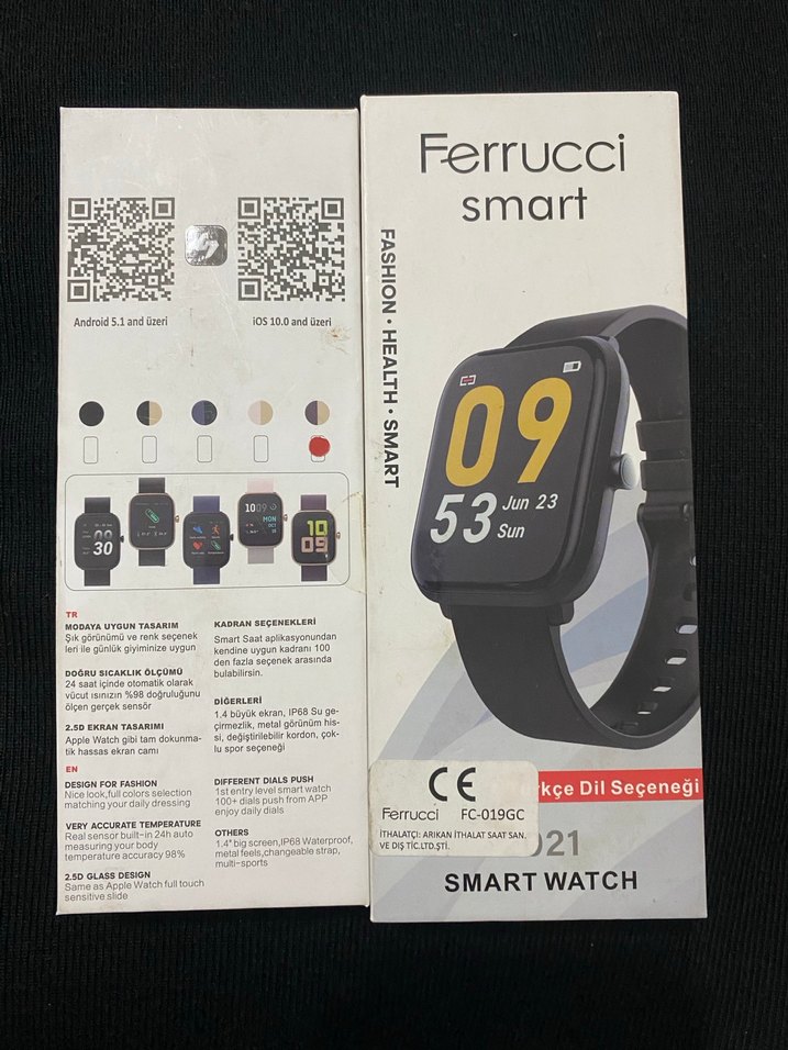 Saat çok kullanılmamıştır 3-4 kez anca kutusu ile gönderim sağlanacak. Ferrucci FC-019GC siyah akıllı saat, çoklu dil seçeneği ve Android ile iOS uyumludur. Doğru sıcaklık ölçümü, 2.5D cam ekran ve suya dayanıklılık sunar. ⌚