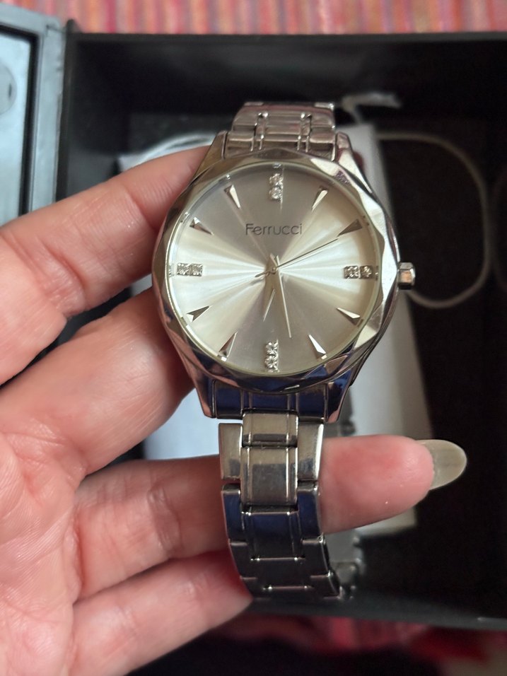 Ferrucci kadın kol saati, gri renkli metal kayış ve kristal saat işaretçilerine sahip yuvarlak kadranıyla klasik şıklığı modern tarzla buluşturuyor. ⌚