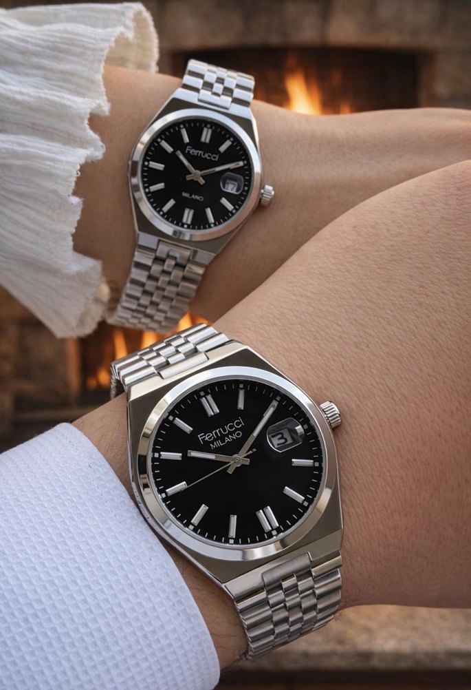Ferrucci Milano erkek saati, siyah kadran ve tarih göstergesi ile modern klasik tarzda, gri metal bilezikli şık bir saat. ⌚