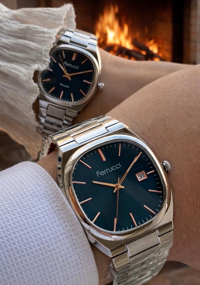 Ferrucci erkek saati, gri kadran ve camel detaylarla modern klasik tasarıma sahip. Tarih göstergeli ve metal bileziklidir. ⌚