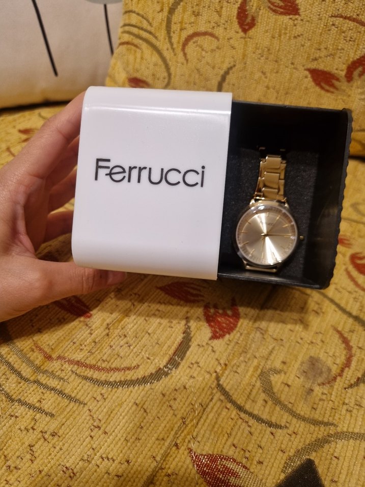 Ferrucci markalı, parlak altın renkli ve tokalı kayışa sahip kadın saati. Paris sokak modasına uygun, trend ve rahat bir tasarım. Hiç kullanılmamıştır. Üzerindeki jelatinler dahi çıkartılmamıştır.