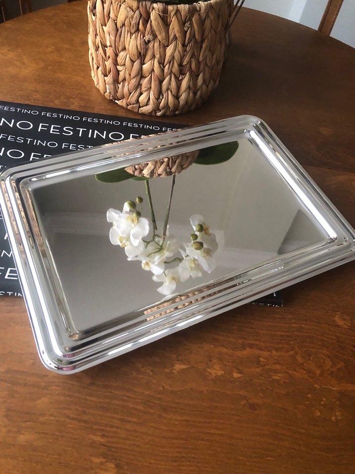 FESTİNO Marka etiketinde gümüş kaplama yazıyor.Hediye gelmişti hiç kullanılmadı.Parlak beyaz metal tepsi, pürüzsüz yansıtıcı yüzeye sahiptir. modern bir görünüm sunar. 40 x 29 cm ölçülerinde