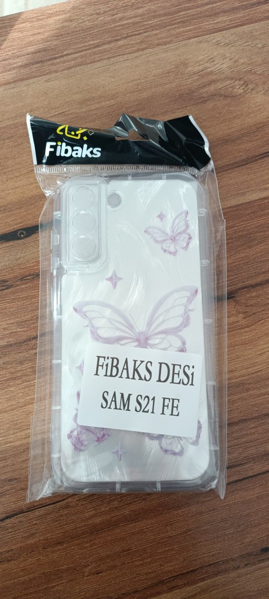 Fibaks markalı, Samsung S21 FE uyumlu, şeffaf ve pastel mor kelebek desenli bohem tarzda telefon kılıfı.