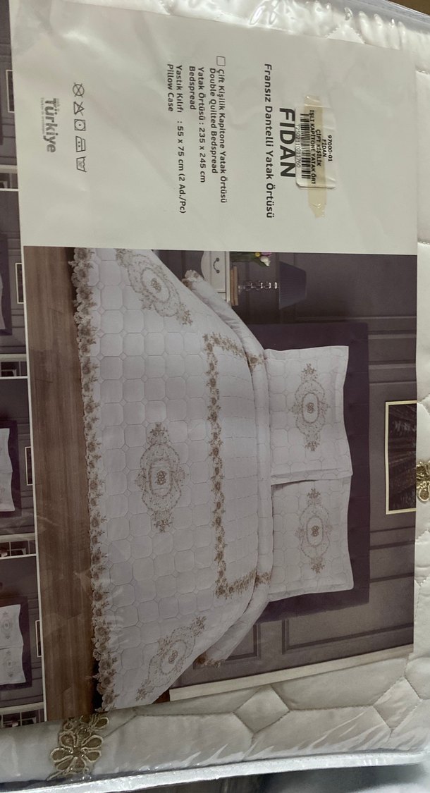 Gri nakışlı ve dantelli beyaz yatak örtüsü, 55x75 cm ölçülerinde, 2 parçadan oluşur. Türkiye yapımı, Fidan markası. ️