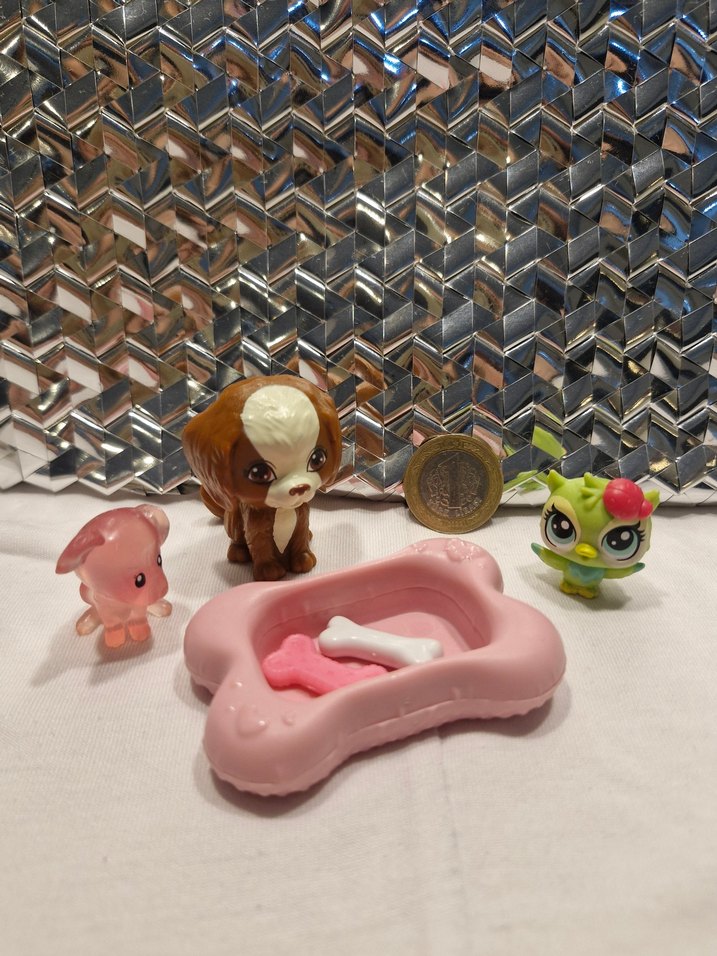 Set içerisinde orijinal Miniş (Littlest Pet Shop – Hasbro) figür ve pembe orijinal Pony (My Little Pony – Hasbro) figür bulunmaktadır. Köpek figüründe üretici etiketi görünmemektedir. Figürler temiz ve sağlam durumdadır. Sete köpek yatağı ve kemik aksesuarları dahildir. Boyut karşılaştırması için fotoğraflarda 1 TL kullanılmıştır. Tek tek değil, set olarak satılmaktadır.