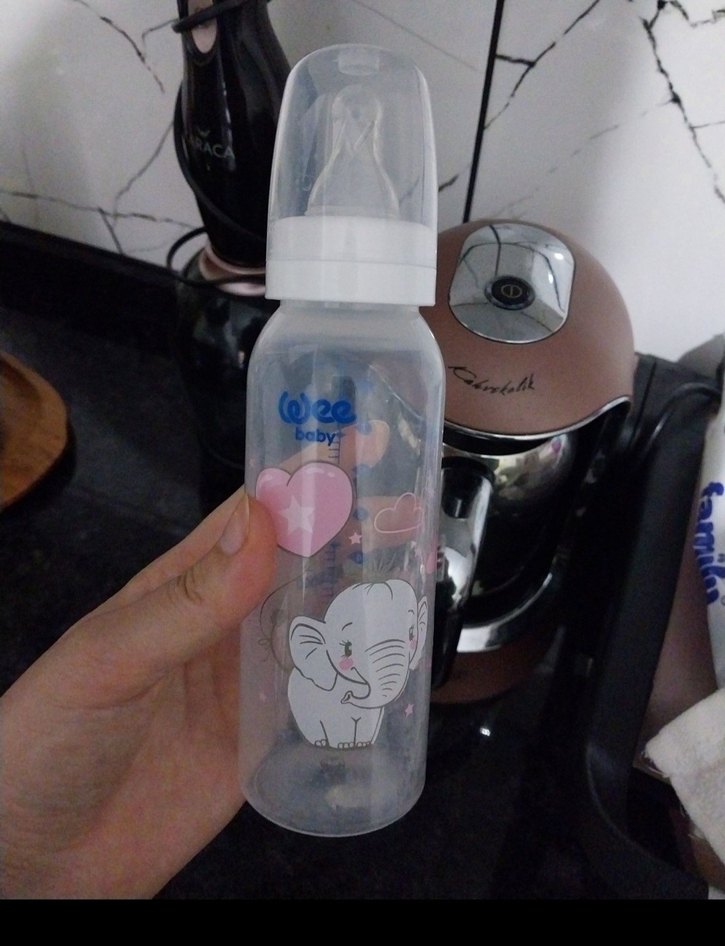 Fil desenli beyaz bebek maması biberonu, şeffaf koruyucu kapaklı ve kolay tutulabilir. Beslenme için uygundur.