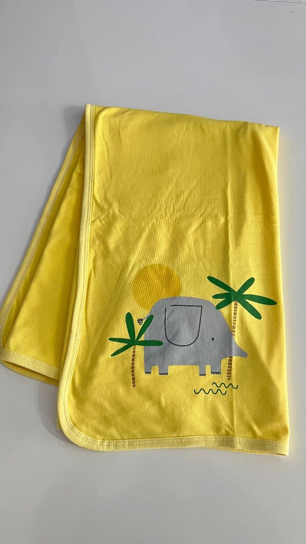 Yumuşak sarı kumaş üzerinde renkli fil baskısı bulunan çocuk battaniyesi, sıcaklık ve konfor sağlar.