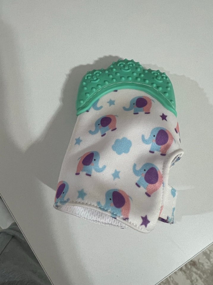 Turkuaz diş kaşıyıcı eldiven, pastel fil desenli yumuşak kumaş ve diş etlerini rahatlatan dokulu üst kısmıyla tasarlanmıştır.