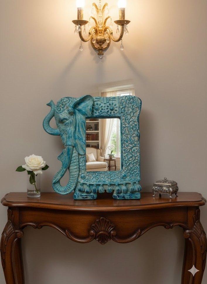 Turkuaz fil figürlü, detaylı desenlere sahip dekoratif ayna. Her odaya sanatsal ve özgün bir dokunuş katar. 100/100 doğal kil