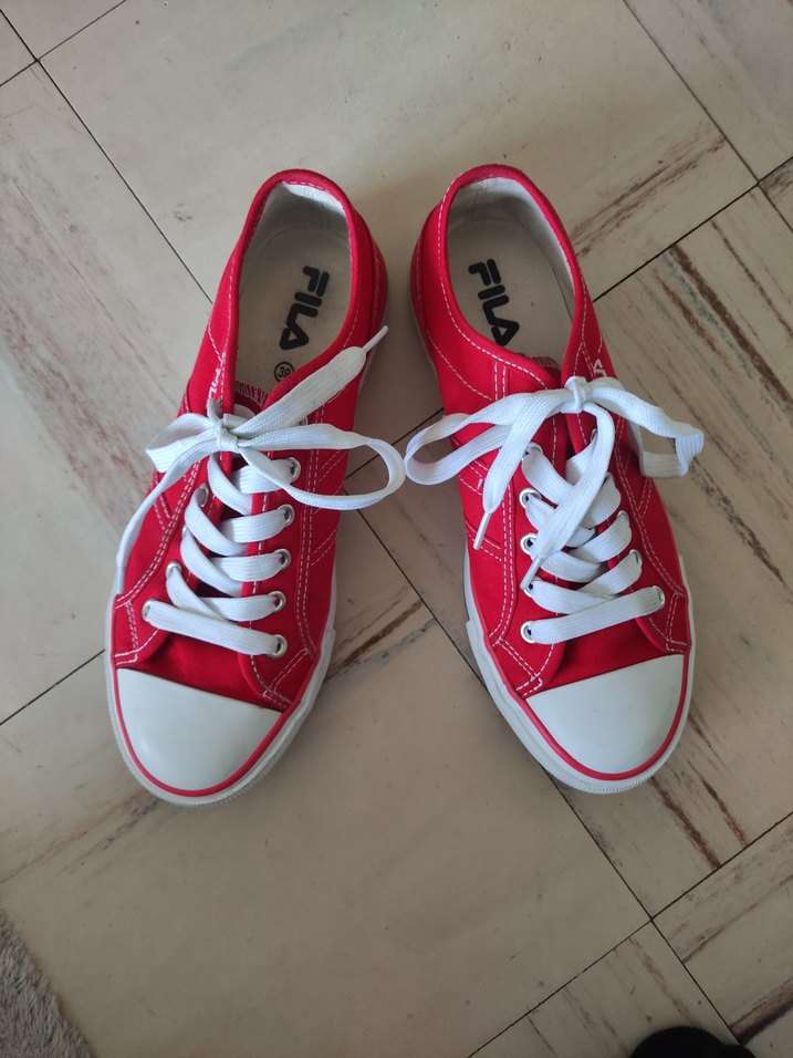 FILA marka kırmızı bağcıklı kadın spor ayakkabısı, düz kauçuk tabanlı, sportif ve sokak stili için uygun. Rahat ve renkli, günlük athleisure tarzına uyumlu.
