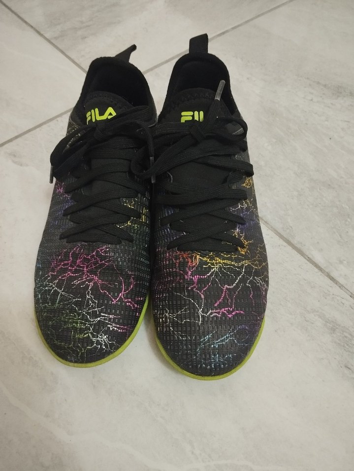 FILA marka, çok renkli tie-dye desenli erkek çocuk futbol ayakkabısı. Kauçuk tabanlı, spor ve sokak stili için uygun. ⚽