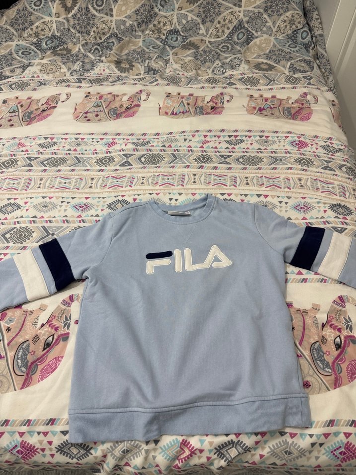 Pastel mavi renkte, uzun kollu ve baskılı detaylara sahip crew neck sweatshirt. Bol kesim ve örme dokusu ile rahat sokak stili için uygun. Önünde FILA logosu bulunur.