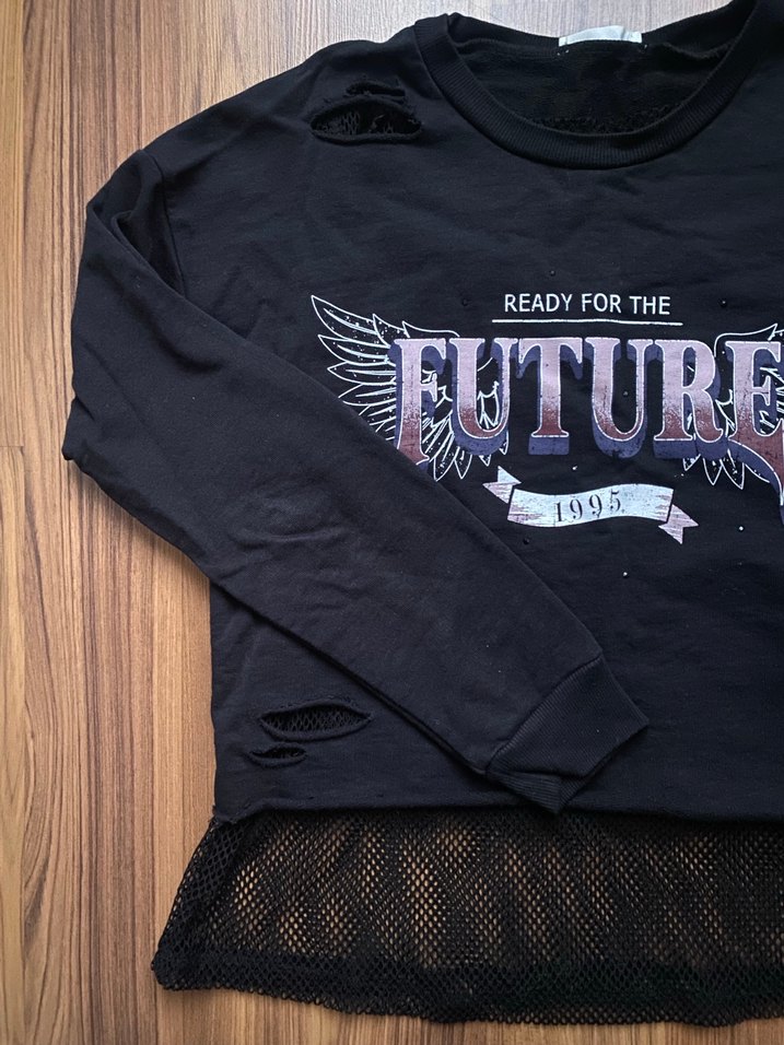 Yuvarlak yaka, uzun kol, üzerinde minik siyah taşlar ve küçük detaylar olan, içeriden file astarlı sweatshirt. (Ürün sadece bir kez kullanıldı.)