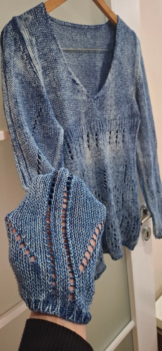 Taşlanmış eskitme kot görünümlü bohem file kazak.